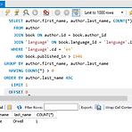 2019/03/05 - [Programming/JOOQ] - [JOOQ-03] 테스트 DB 을 생성하고 JOOQ 객체 생성하기 좀 더 복잡한 질의를 실행해보겠습니다.저의 경우 JOOQ 으로 개발할 때에는 먼저 DBMS 에 직접 SQL 로 명령을 실행해본 뒤에 실제 본문을 작성해봅니다. JOOQ 는 Type Safe 등을 지원하긴 하지만, 이것이 올바른 질의인지는 판단하지 않기 때문입니다. 다음은 실제 질의해 본 것입니다. SELECT author.first_name, author.last_name, COUNT(*) FROM author JOIN book ON author.id = book.author_id JOIN `language` ON book.language_id = `language`.id WHE..